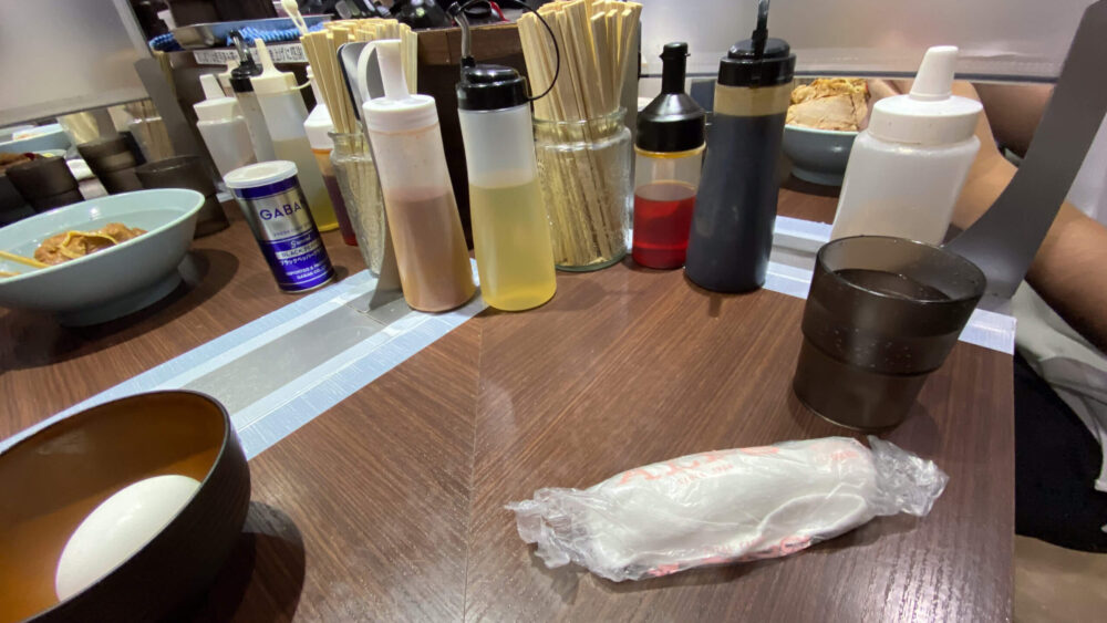 ▲卓上調味料がめちゃくちゃ豊富。胡椒、唐辛子、すりごま、ラー油、醤油、お酢など。
