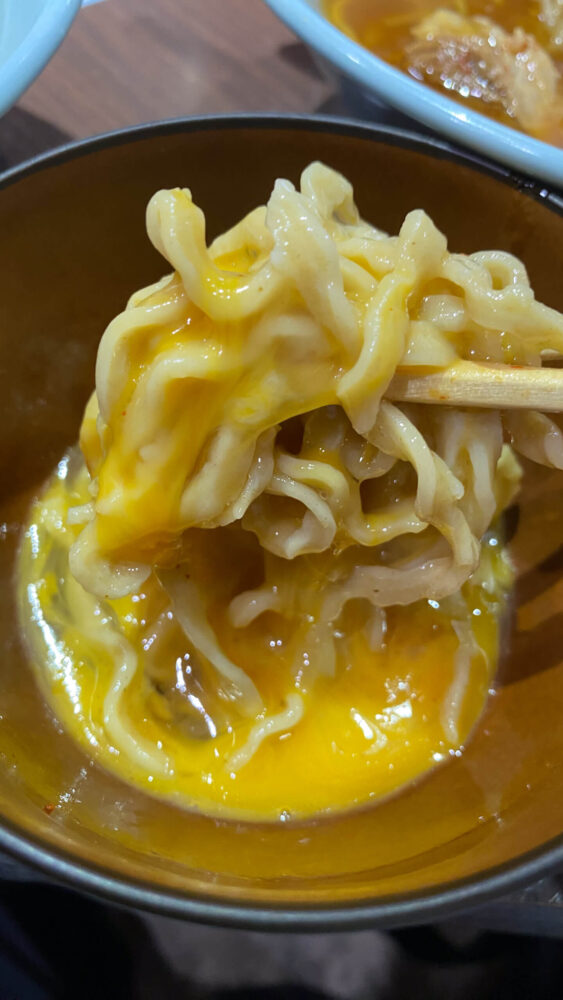 ▲後半は麺も味変していきます。まずは生卵ですき焼き風。辛旨から一気にマイルドになってこれも良き。