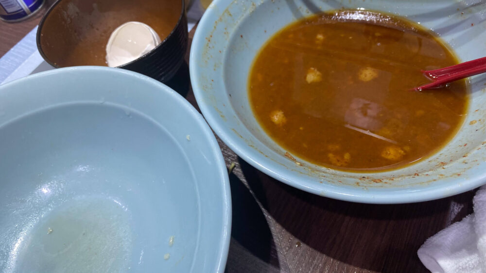 ▲つけ汁は豚と魚介の旨味に唐辛子系の辛さがプラスされて美味しい!旨味と辛さのバランスが良き。