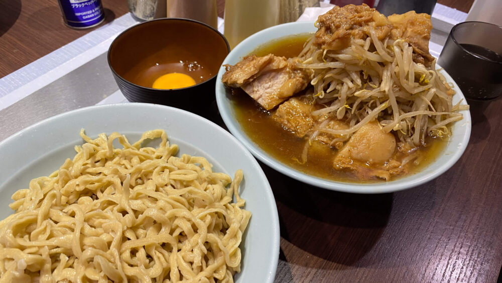 「ブタメン少な目(ちょいヤサイちょいアブラ)+辛魚豚つけ麺変更券+生卵」を実食!