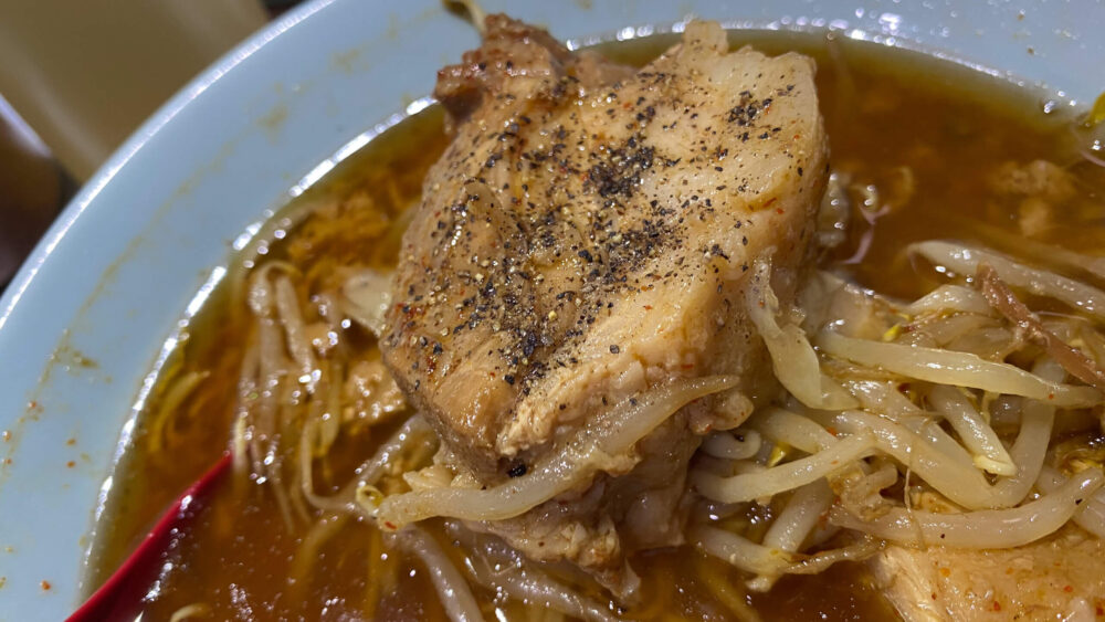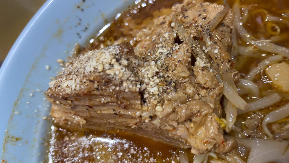 ▲豚のボリュームがえぐいので味変して早めにやっつけます。卓上の胡椒で胡椒豚を生成。脂身と胡椒の相性はヤバいくらいに合います。