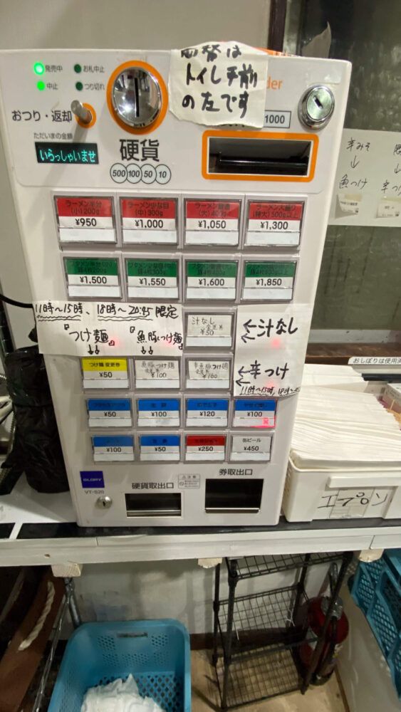 今回はブタメン少な目+辛魚豚つけ麺変更券+生卵を注文しました!