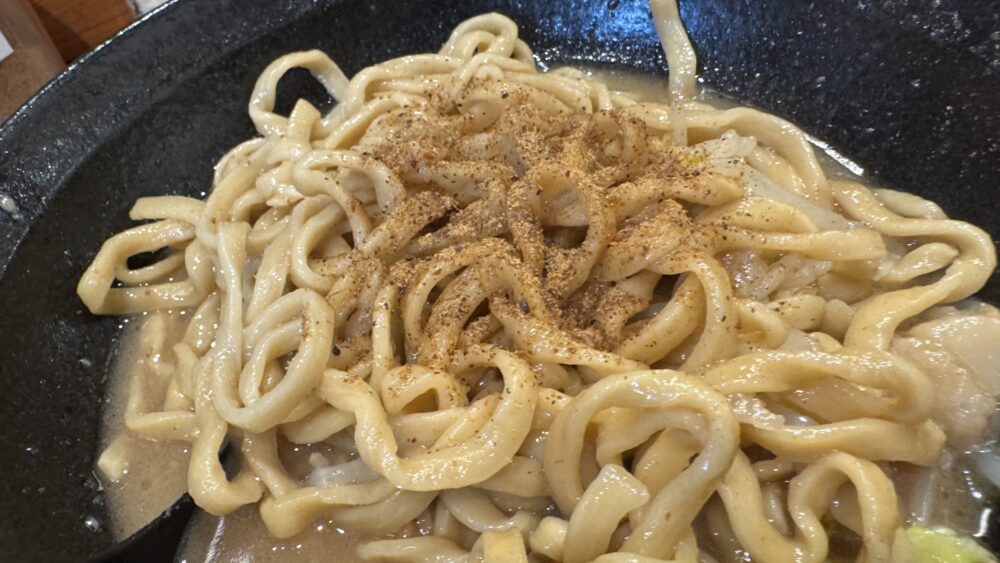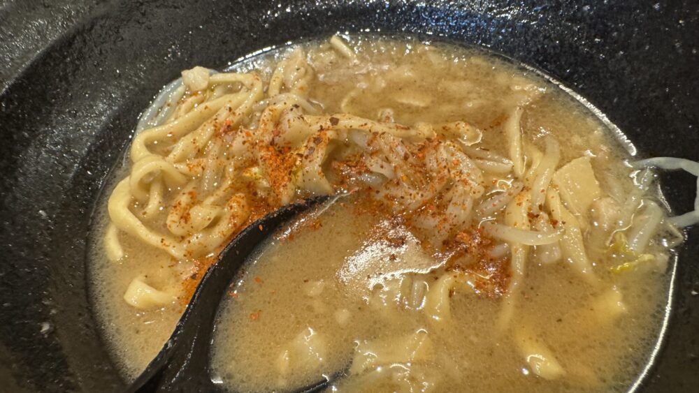 ▲卓上の一味唐辛子で味変。終盤は辛旨にすると、スルッと完食できちゃいますね。
