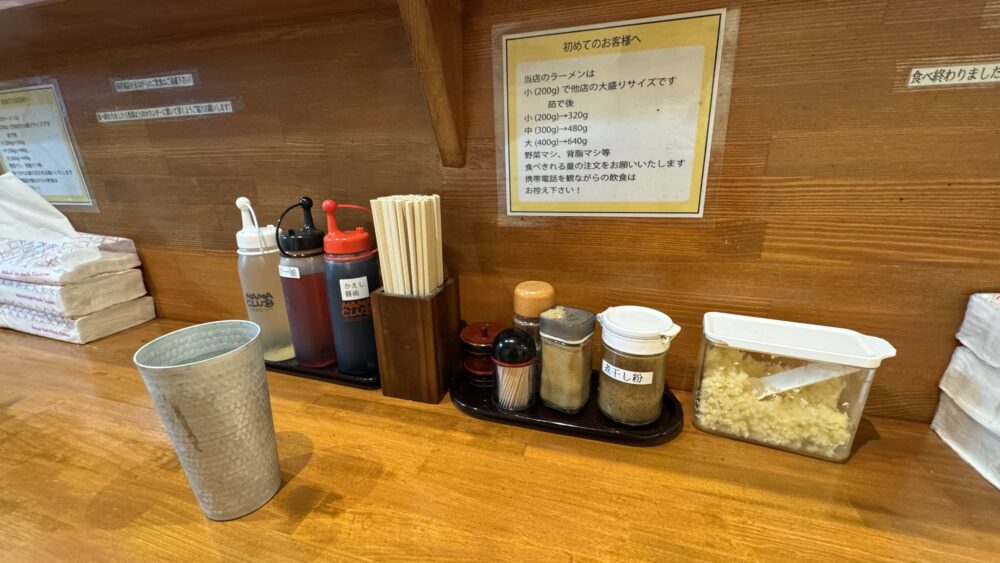 ▲卓上調味料は、お酢、ラー油、かえし醤油、一味唐辛子、ラー油、胡椒、煮干し粉、ニンニクといった豊富なラインナップ。