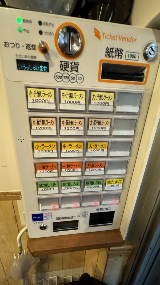 ▲店内の券売機で注文します。麺量は小・中・大で同一料金です。