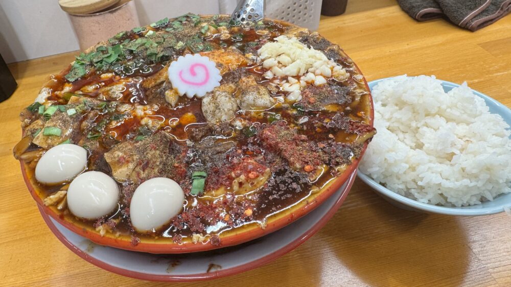 「旨辛痺麺 辛口(大)+ライス+まさお(うずらの味玉3ケ)」を実食!