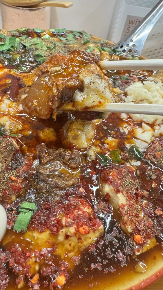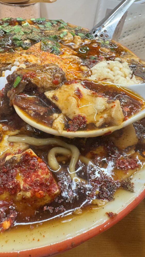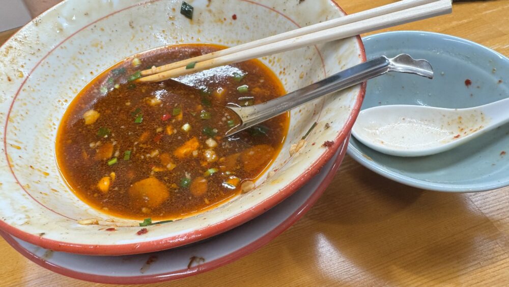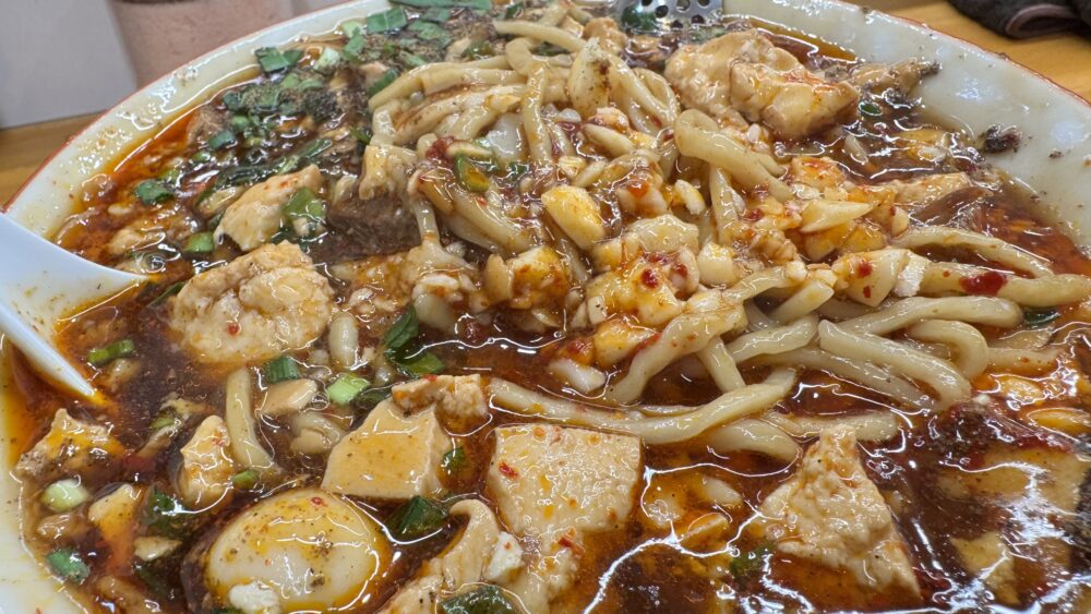 ▲スープは麻婆餡のとろみに、唐辛子と山椒が効いて辛旨。辛口にしましたが、ちょっとピリッとくる程度で旨さの比重が高め。