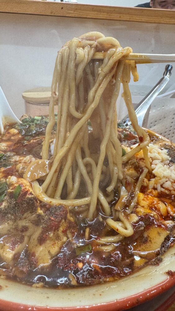▲麺は、丸っぽいモチっと食感。麻婆餡が絡んで美味しい。アツアツなのも良き。