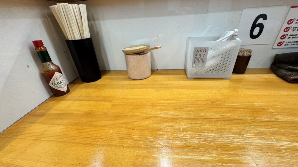 ▲卓上調味料は藻塩とタバスコ。シンプルながら特徴的な構成ですね。