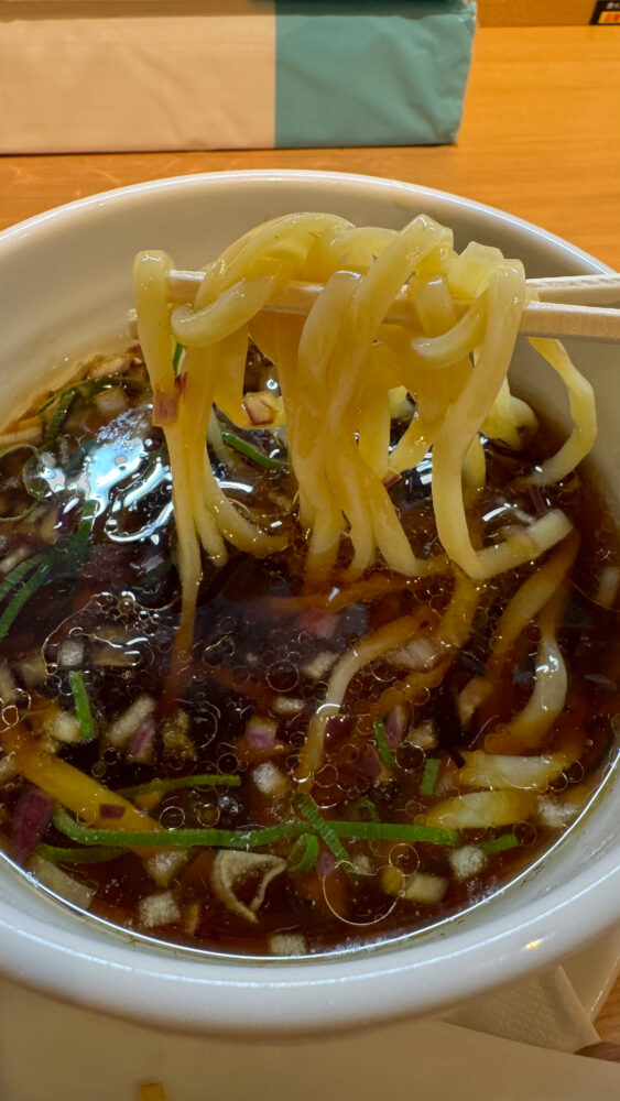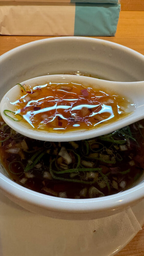 ▲つけ汁は醤油系のすっきりタイプ。ねぎなどの香味野菜が入っていて良いアクセントに。