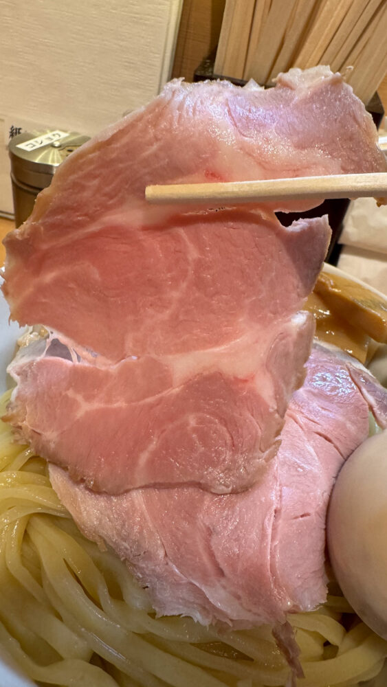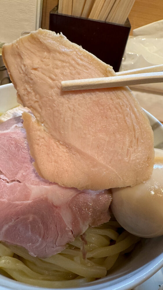 ▲低温調理された鶏むね肉のチャーシュー。こちらもつけ汁にディップして食べると、しっとり柔らかくて旨し。