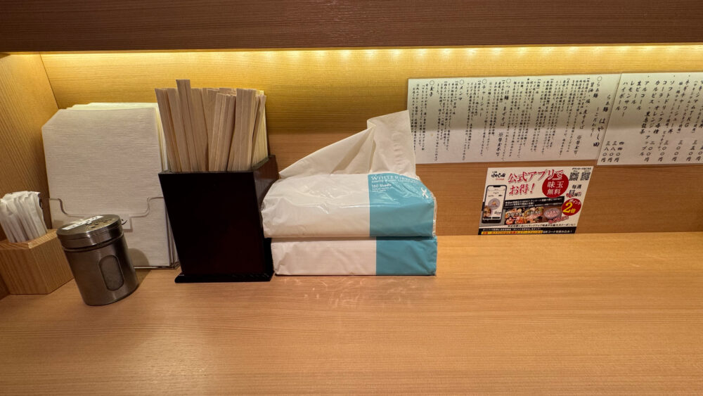 ▲卓上調味料はコショウのみのシンプルな構成。追加注文用のメニューやお店のこだわりの張り紙もありますね。