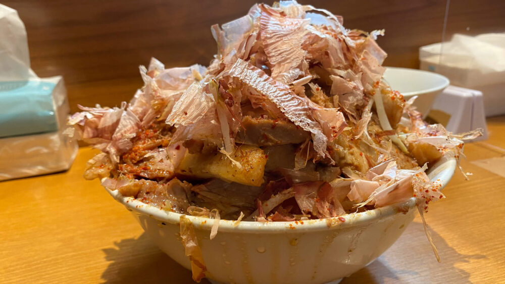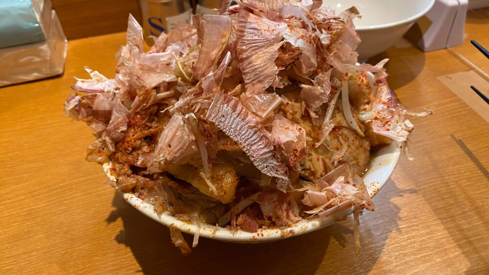 いつものボリューミーなラーメンの上に大量の鰹節が躍っています!インパクト大!