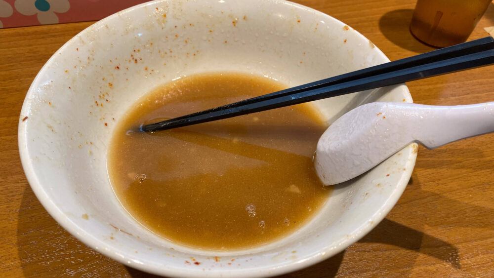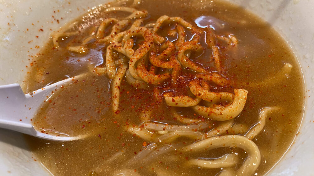 ▲終盤は卓上の一味唐辛子で辛さブースト!完食までラストスパート。