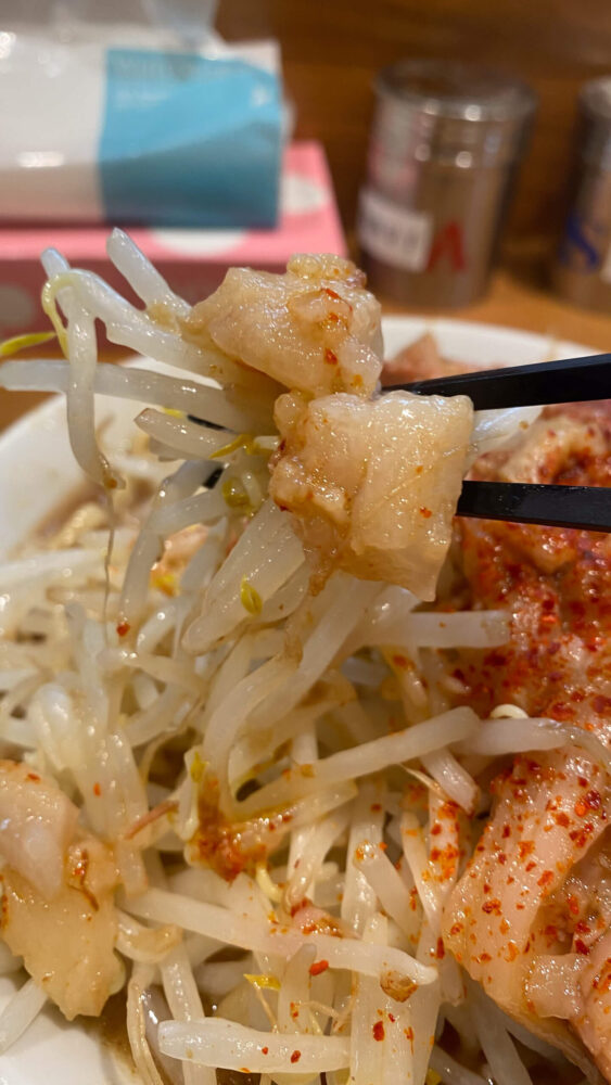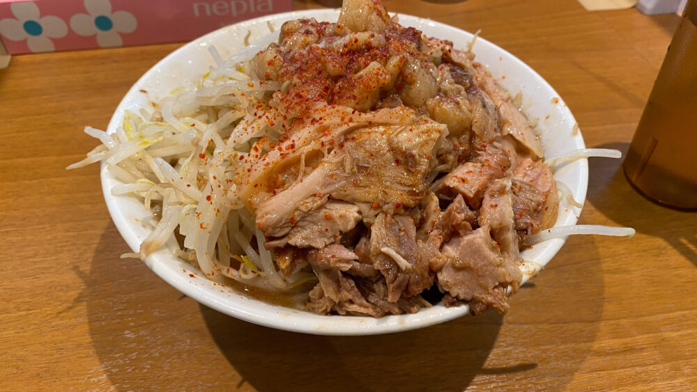 豚増しはないにもかかわらず圧倒的な豚の量、そしてデフォで一味唐辛子がかけられるのが珍しい!