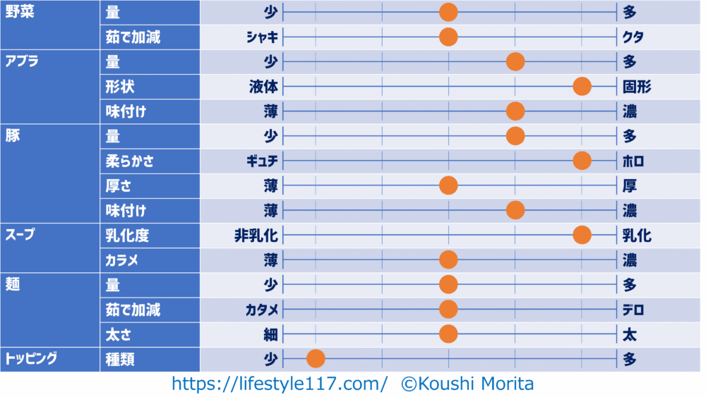 私は原則ニンニクを入れない(妻に怒られるので)ため、項目からニンニクは除外しています。