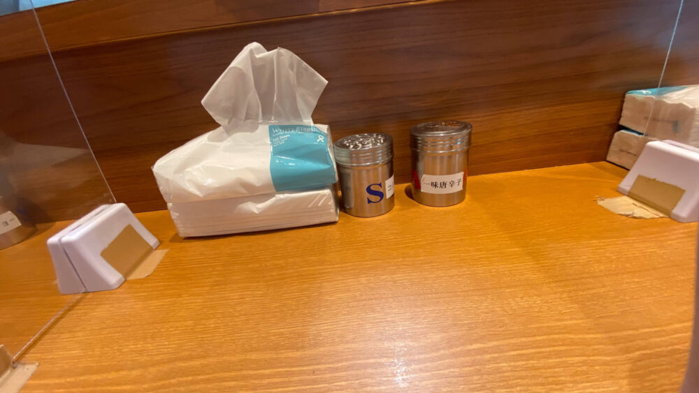 ▲卓上調味料は一味唐辛子とコショーとこちらもシンプル。