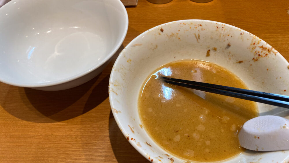▲ある程度上物を食べ進めたら、つけ汁も確認できました。かなりのド乳化で旨味が濃いです。