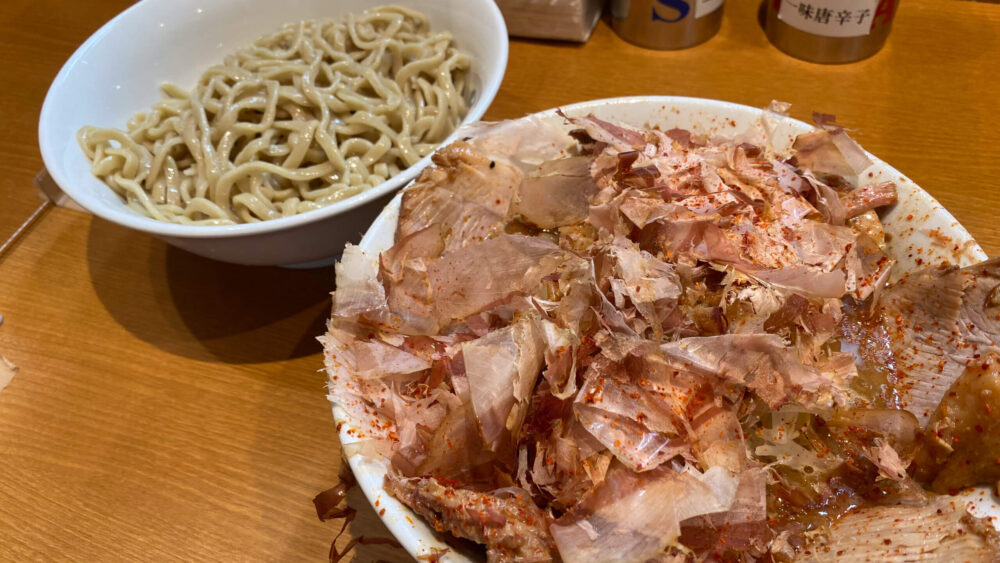 つけ汁がほとんど隠れるほどの大量の鰹節!華やかですし、鰹節の良い香りが食欲をそそります!