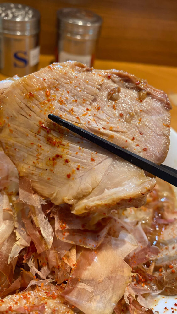 ▲大量の鰹節で気づきにくいですが、相変わらず豚の量もすごいです。花びら状の盛り付け。