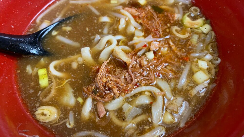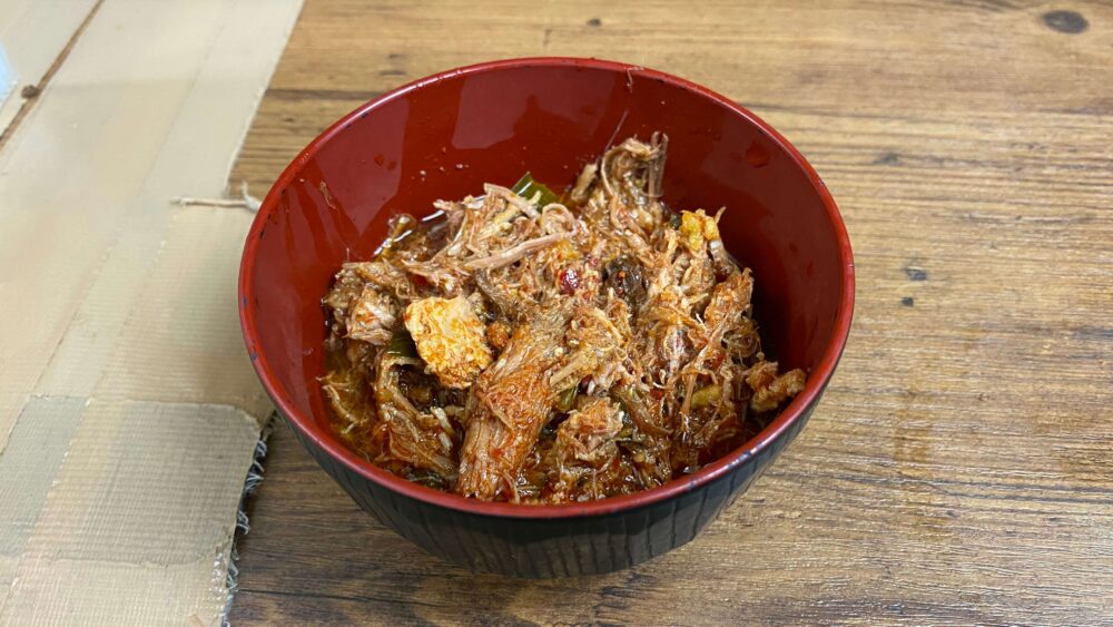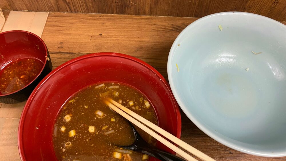 ▲後半はほぐし豚をつけ汁にイン。急激にピリ辛しょっぱなつけ汁へ変貌。食欲が復活します。