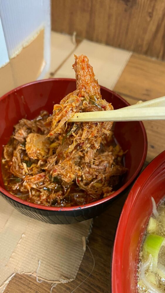 ▲有料サイドメニューのほぐし豚。けっこうピリ辛テイストで濃いめの味付け。