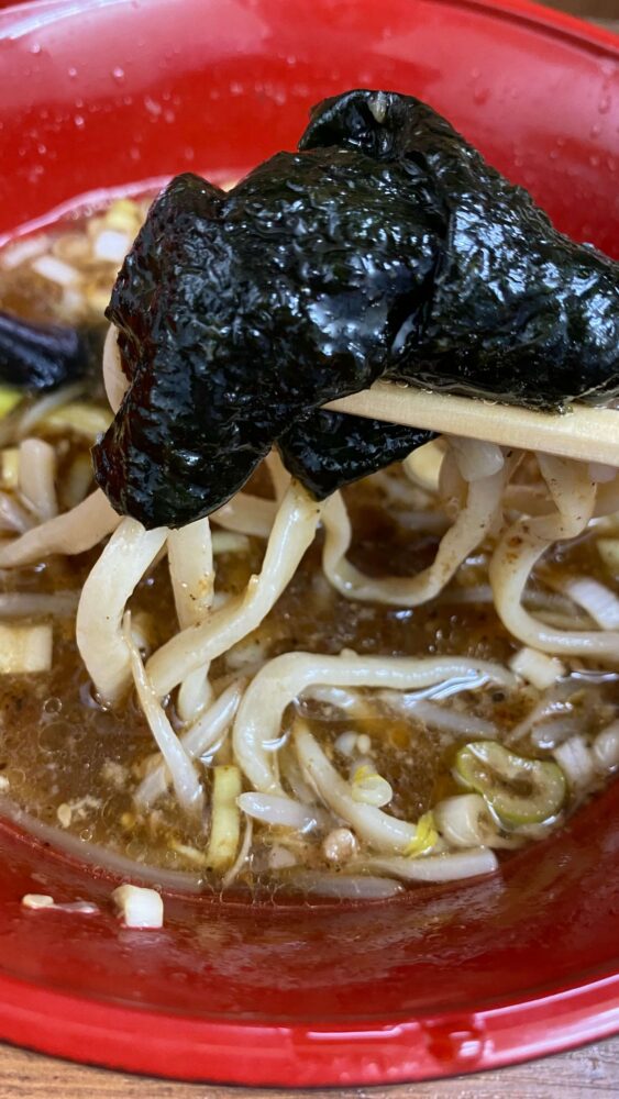 ▲貴重な1枚の海苔で麺を巻いて食べると至福。海苔を追加したい・・・!