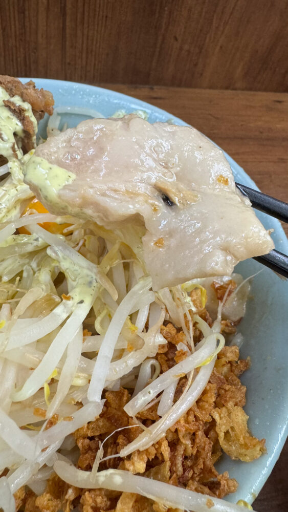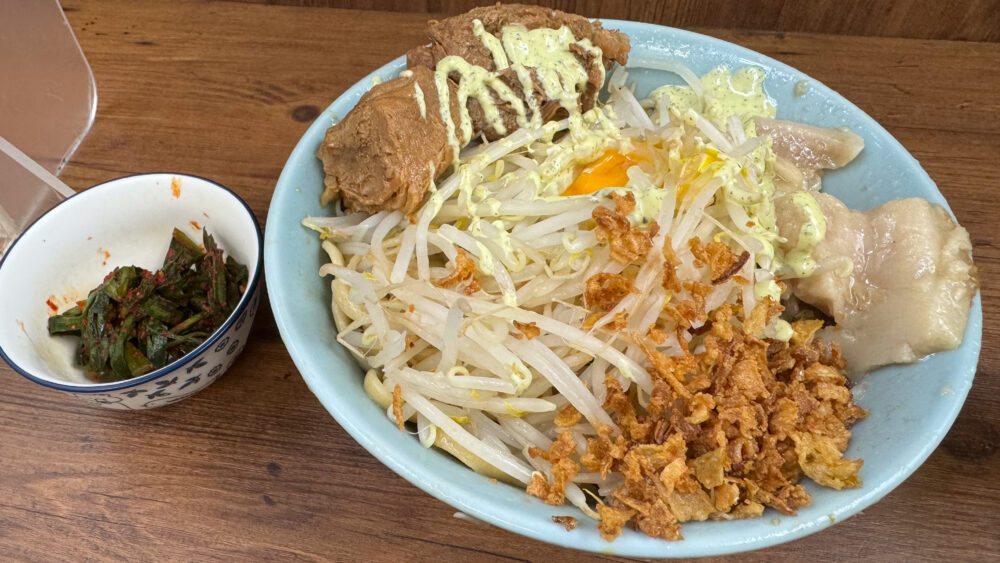 「まぜそば改(ニンニク以外全部)+ブタ増し(2枚)+にらキムチ」を実食!