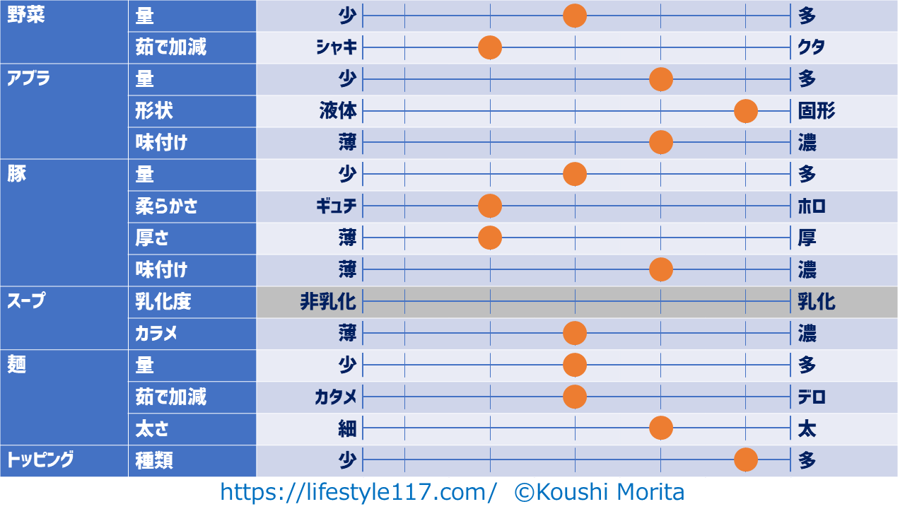 まぜそばのため、スープの乳化度はグレーアウトしています。
