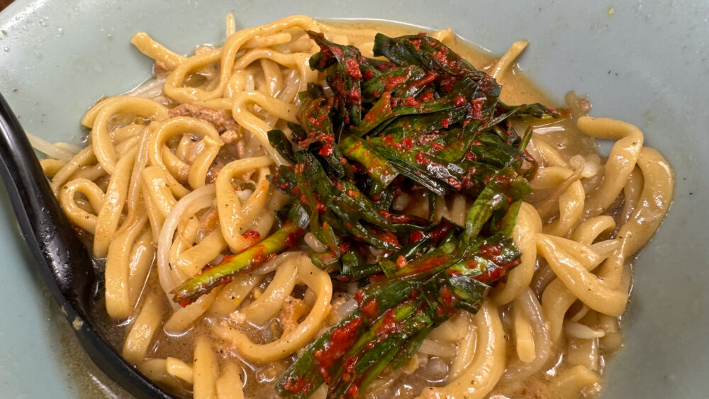 ▲有料トッピングのにらキムチで味変。けっこう本格的に辛く、一気に韓国風のテイストで旨し。