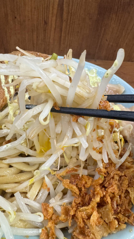 ▲ある程度豚と野菜を食べたら、しっかり麺とタレを混ぜ合わせます。