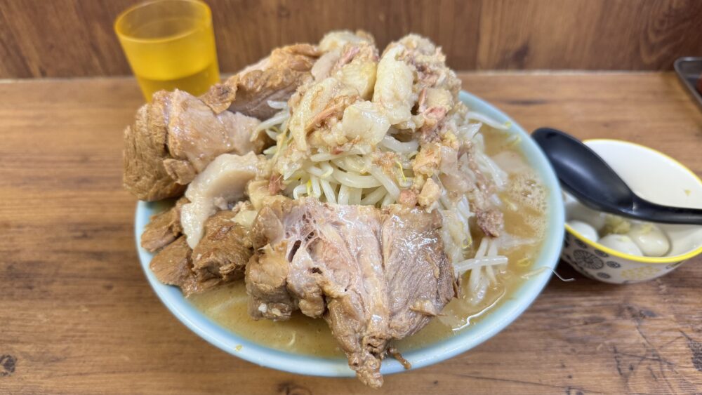 ブタ入り(ヤサイアブラ)+ブタ増し(2枚)+うずら玉子が着丼!豚と背脂がデカくなってパワーアップしている・・・!