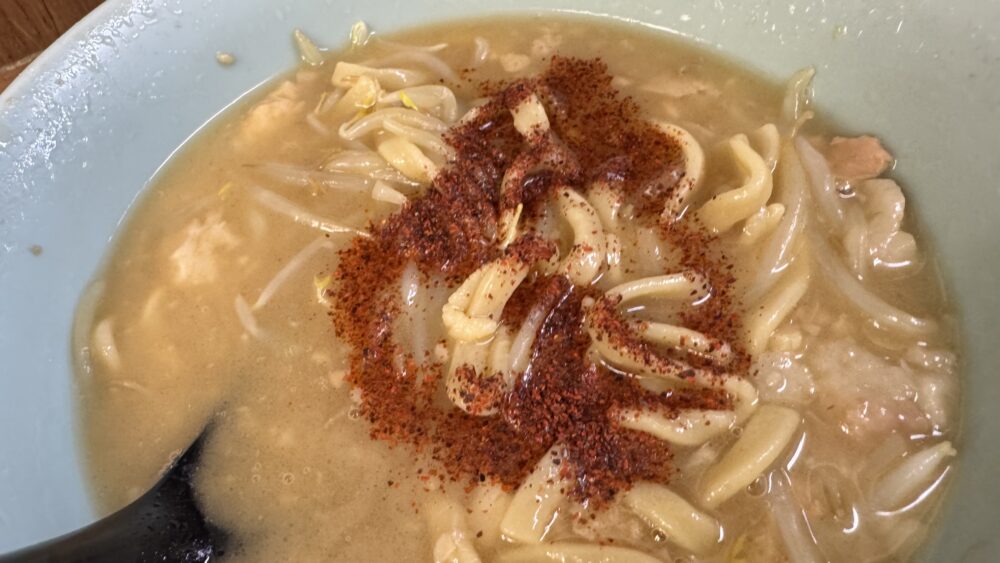 ▲卓上の一味唐辛子で味変。辛旨になるので、終盤のペース維持に効果的でした。