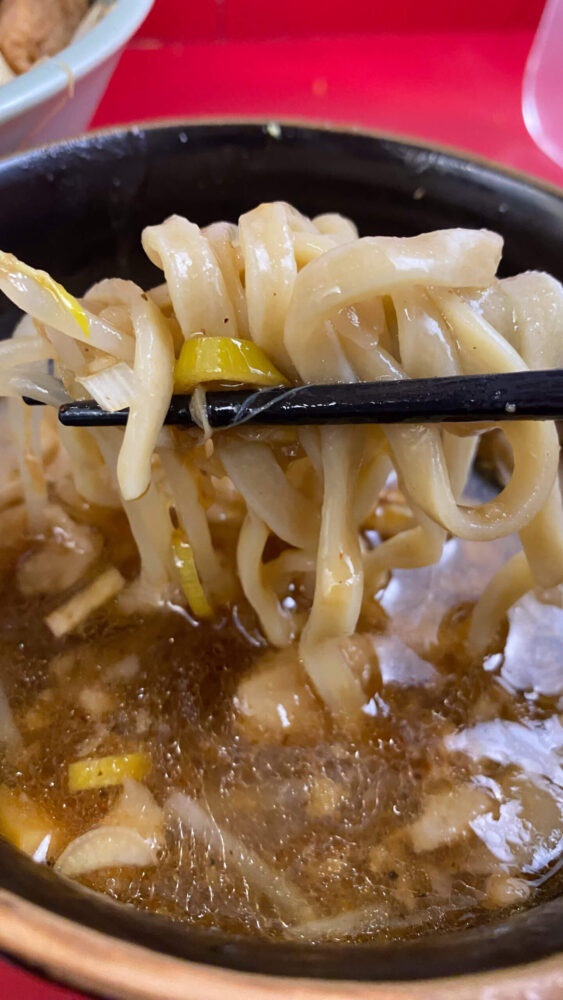 ▲麺をつけ汁へ投入。麺がつけ汁をよく持ち上げてくれて美味。ズバズバいけます。