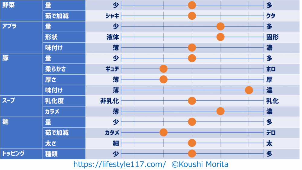 イケジ(池袋東口店)と系列が一緒っぽいので、味の系統や有料トッピングのラインナップはだいぶ近いです。