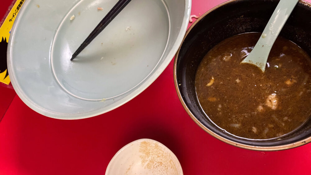 ▲終盤は有料トッピングの魚粉をつけ汁へ投入。より豚骨魚介系のつけ汁になりドロ感が良き。