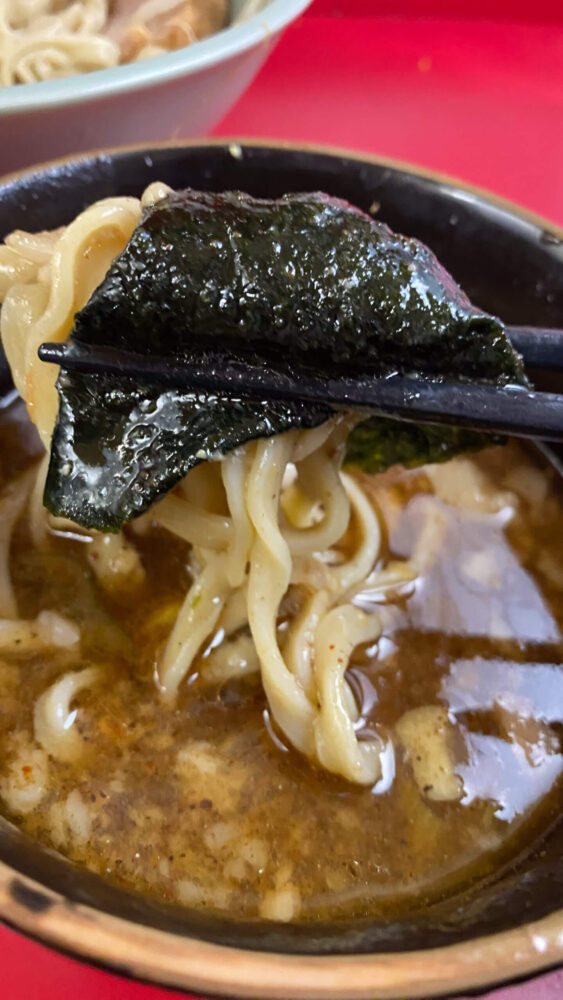 つけ汁上の海苔に乗った魚介をどれだけつけ汁に溶かすかで、豚骨魚介要素を調節しながら食べることもできます。