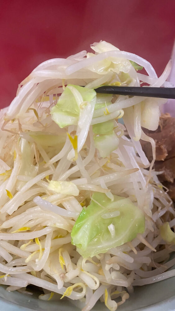 ▲野菜は標準的な茹で具合。もやしとキャベツの比率は1:9くらい。