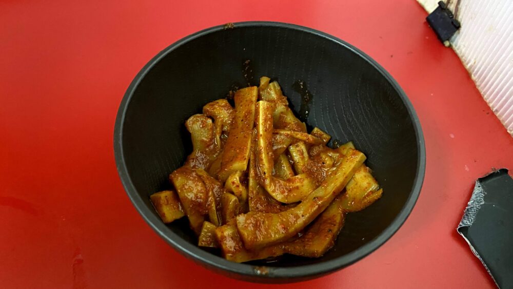 ▲真っ赤で結構辛そうなビジュアルなメンマ。
