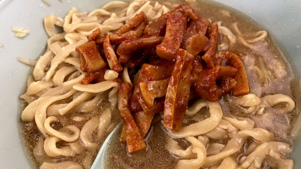 天地返しからからのメンマ投入で二郎なのにピリ辛スープを楽しむ!