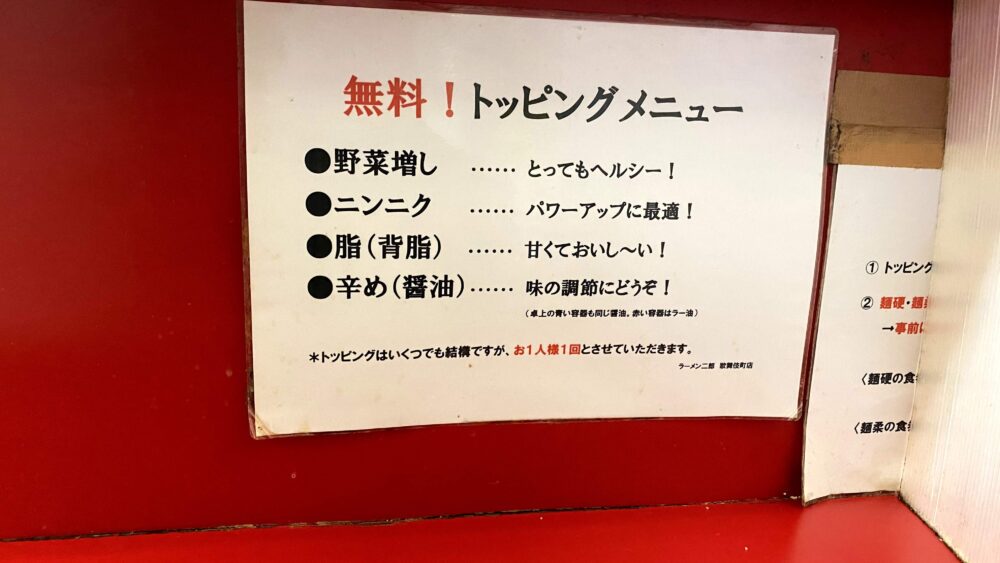 ちなみに、このお店の無料トッピングは以下のとおり。