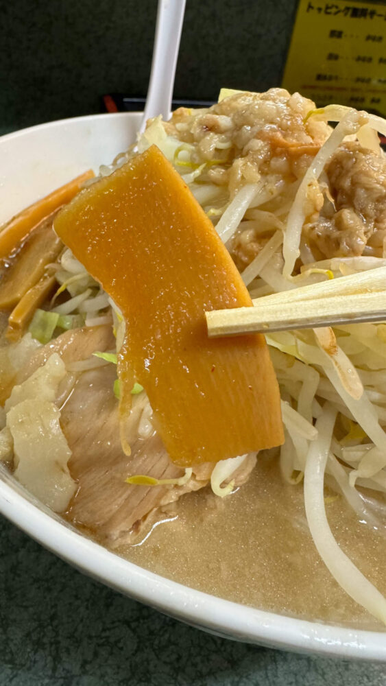 ▲有料トッピングで追加したメンマ。幅広めのカットですが、意外と味・食感はバランスタイプ。