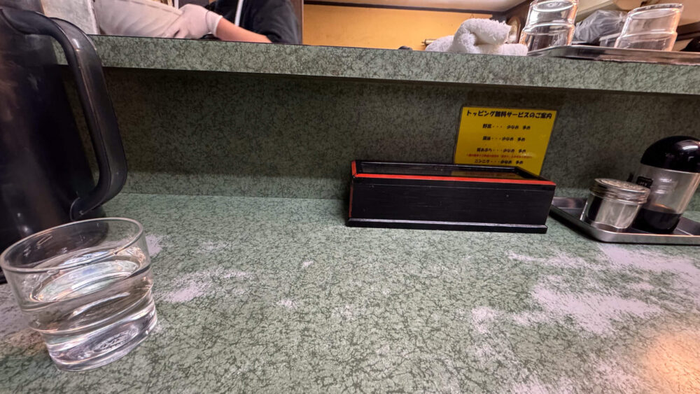 ▲卓上調味料はカエシ、一味唐辛子、胡椒というシンプルな構成。