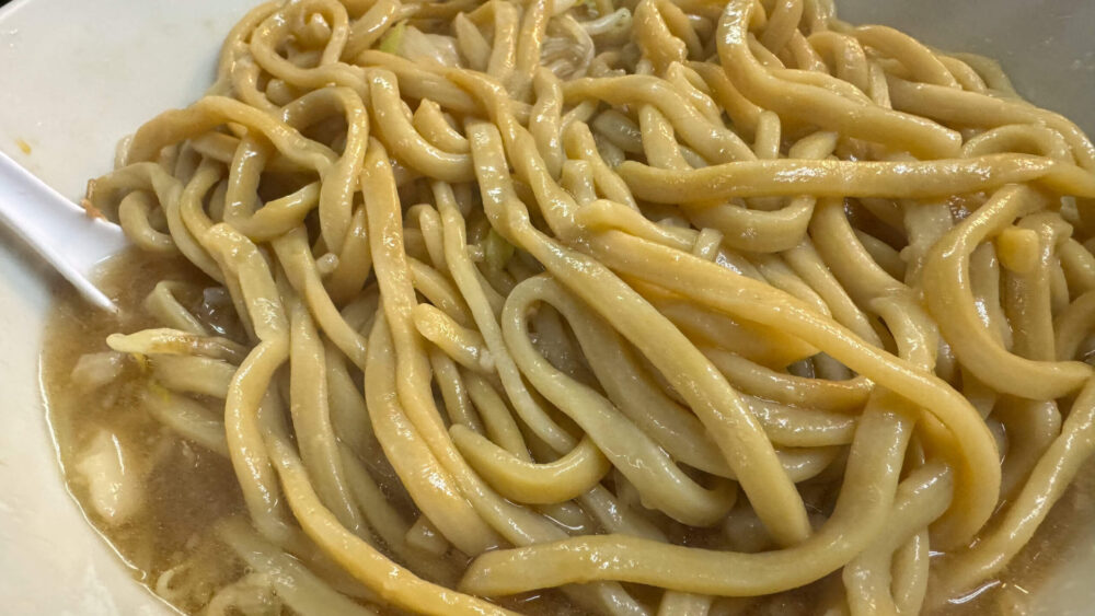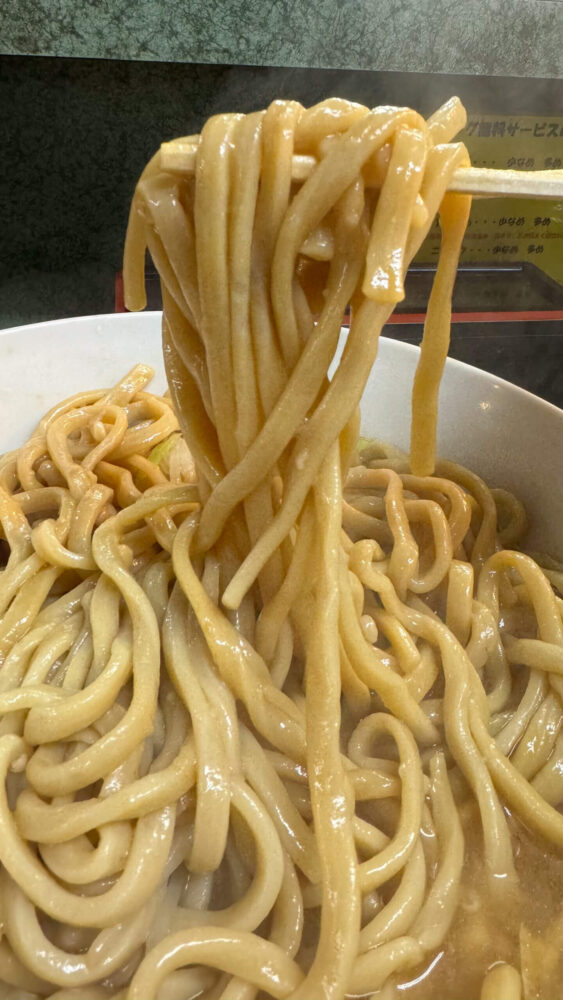▲麺は極太。ワシっとしつつも、脂をまとっているので滑らかなすすり心地。醤油が効いたスープとマッチして旨し。
