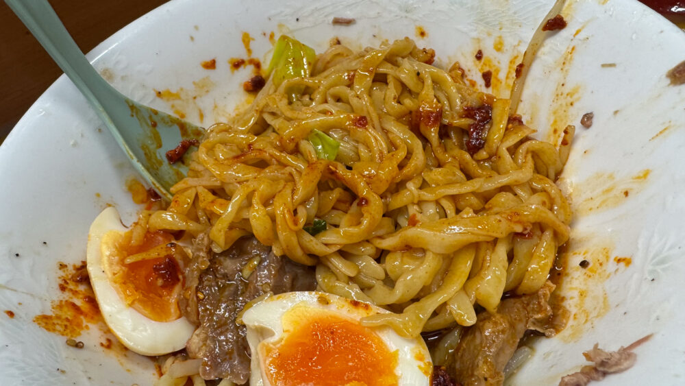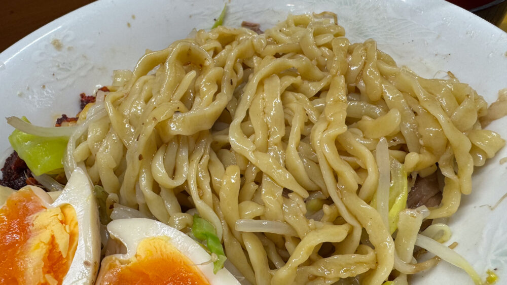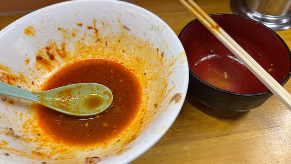 ▲上物をある程度食べたら麺とタレをしっかり混ぜ合わせます。ただし、ラー油は後で味変に使いたいので、うまく避けます。