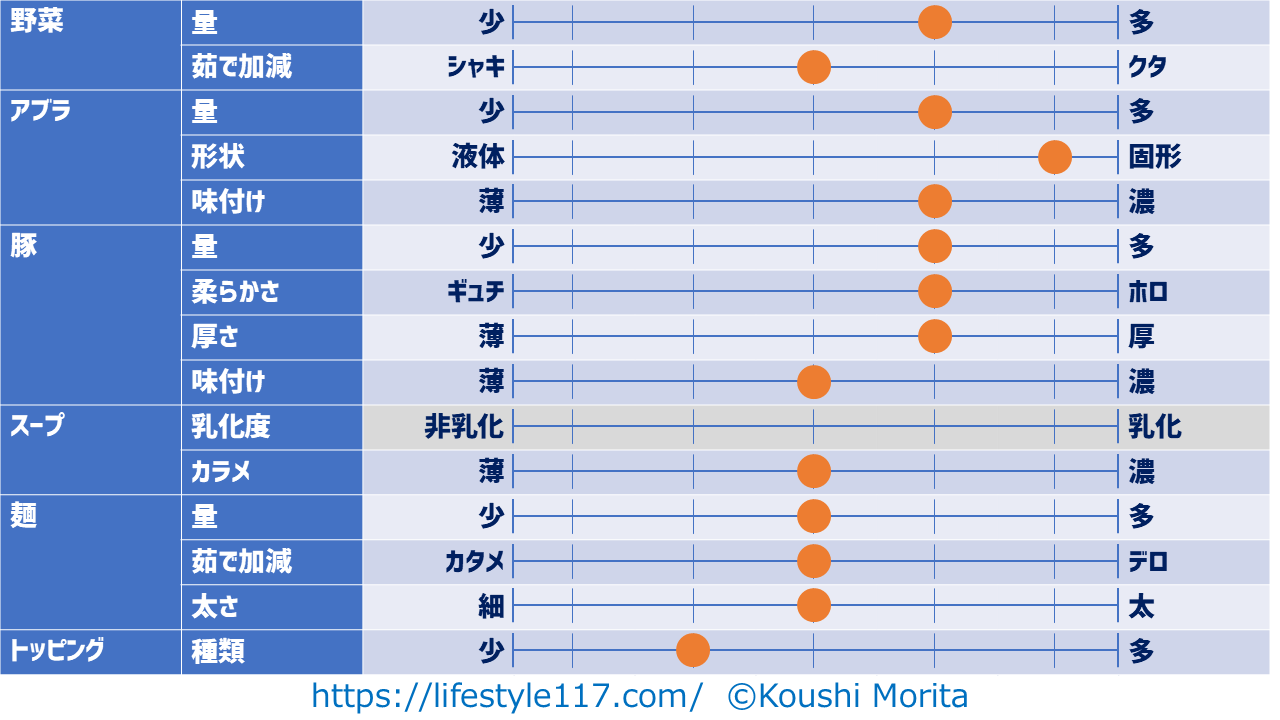 冷やし麺でスープがないため、スープの乳化度はグレーアウトしています。