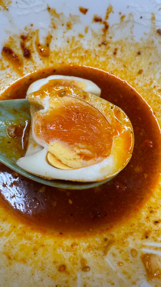 ▲〆のデザート代わりに味玉。ラー油のピリ辛がほんのり加わっても美味しいですね。