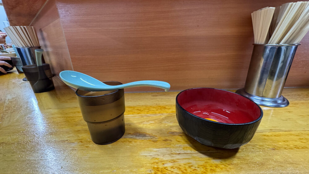 ▲卓上調味料はカウンターの上にあり、白胡椒、ブラックペッパー、一味唐辛子、粗挽き唐辛子、カエシ。生たまごの提供が神速でした。