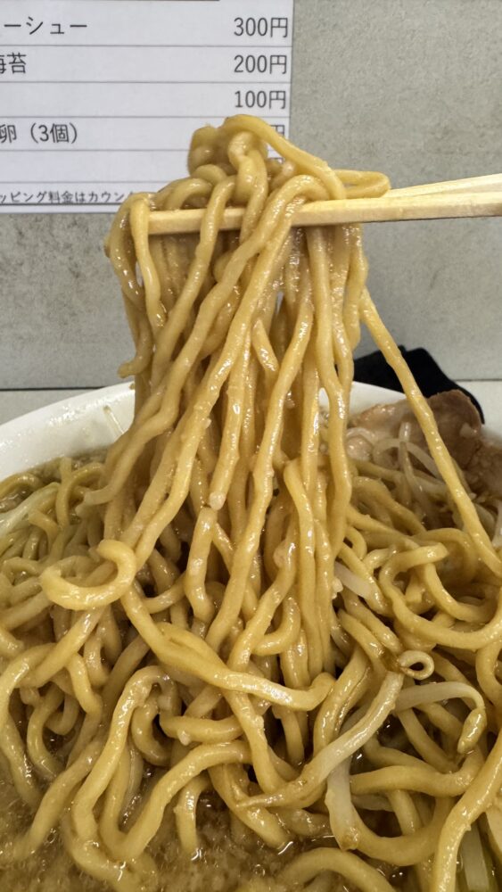 ▲麺はモチプリ食感。二郎系にしては細めですが、背油チャッチャなスープが絡んで旨い。