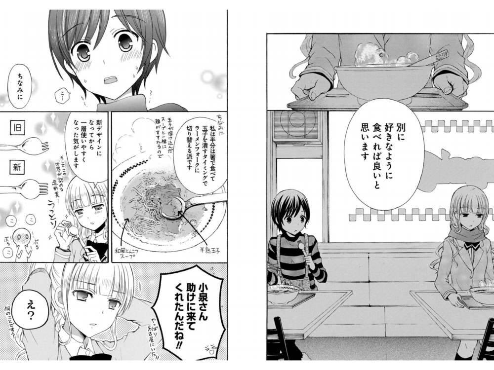 ちなみに私は半分は箸で食べて玉子を潰すタイミングでラーメンフォークに切り替える派です引用元: ラーメン大好き小泉さん2巻